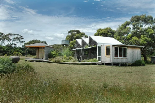 Some of the past is captured with reuse of floor boards as decorative walls in the new home. For the most part the home is passively heated and features a concrete slab close coupled to the earth to take advantage of stable temperatures. Strategic placement of windows provides cross flow ventilation. Locally sourced timber used extensively addresses the strong sustainability credentials of the home.